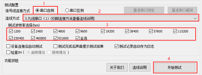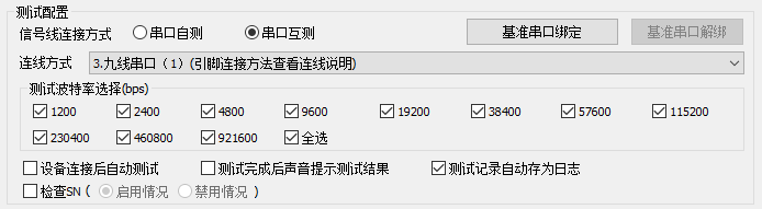 | 测试波特率选择 | 选择其中1个波特率或者多个波特率测试,默认测试的波特率全选进行测试。 |
