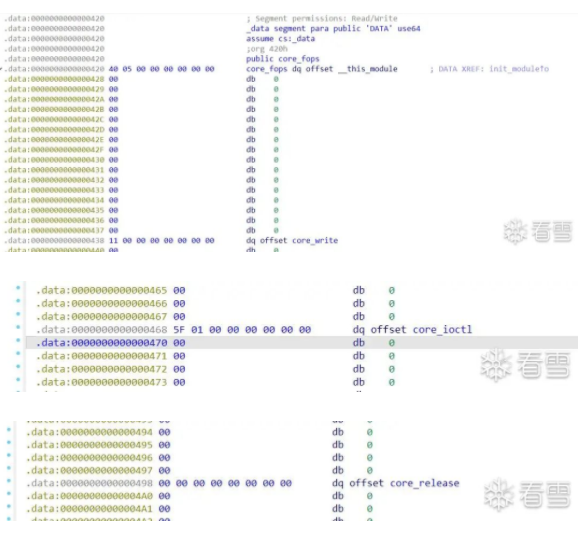 可以知道相差对于v5相差0x40,所以咱们设置的off也是0x40我们还可以来看看file_operations,(不秦楚的大伙可以看看我的上一篇环境搭建的文章),可以看到他只实现了write,ioctl,release的系统调用: