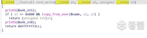 - core.ko 所实现的系统调用write可以发现其中可以将我们传入的值写到bss段中的name上面,天助我也,所以咱们就可以在上面适当的构造rop链进行栈溢出了
