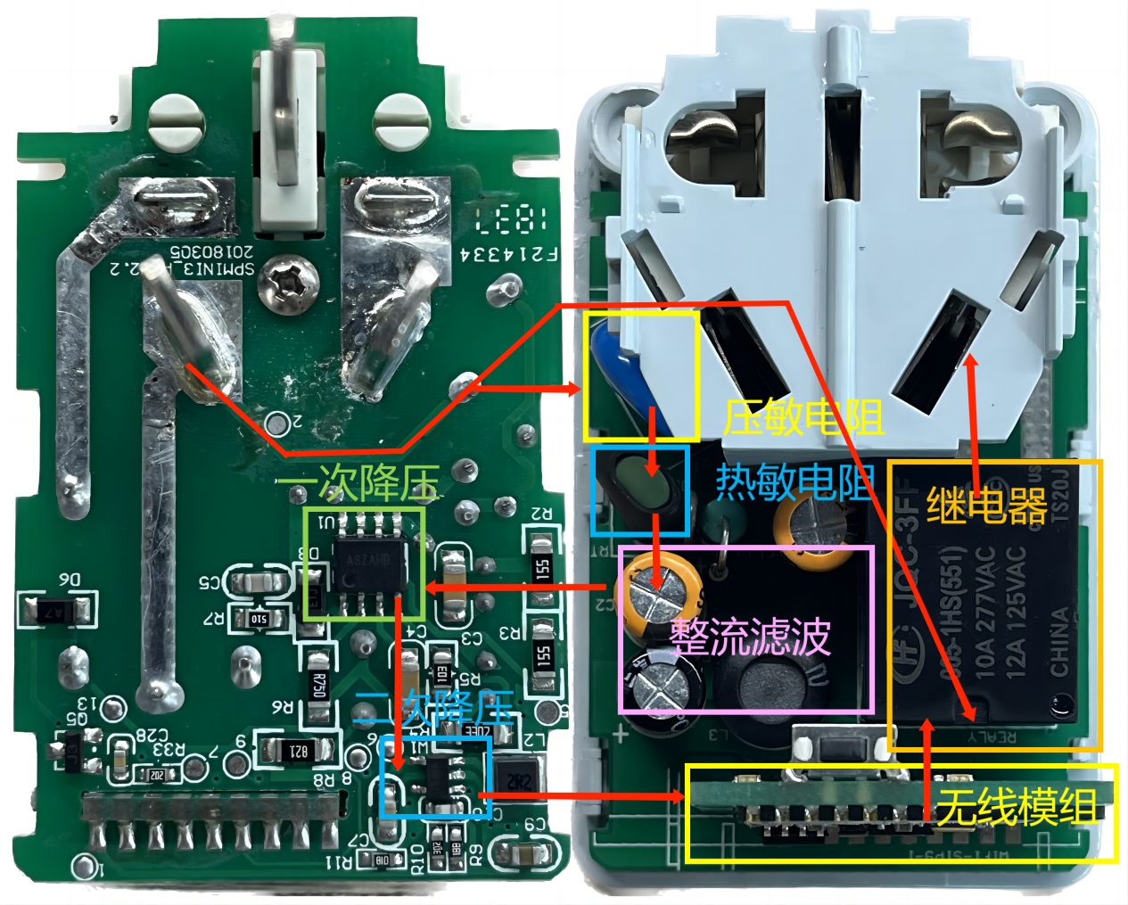 通过拆解分析,WiFi智能插座内部结构及工作原理如上图所示。