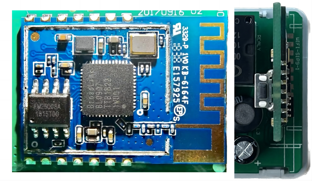 在无线连接方面,智能插座直接采用成品的WiFi模组进行联网,实现WiFi数据的传输。WiFi模组内部采用了无线主控+存储的解决方案,主控芯片为博通的BL0907,主要负责无线数据的收发,以及继电器的开关控制。