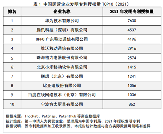 中国民营企业2021年发明专利授权量前十榜单