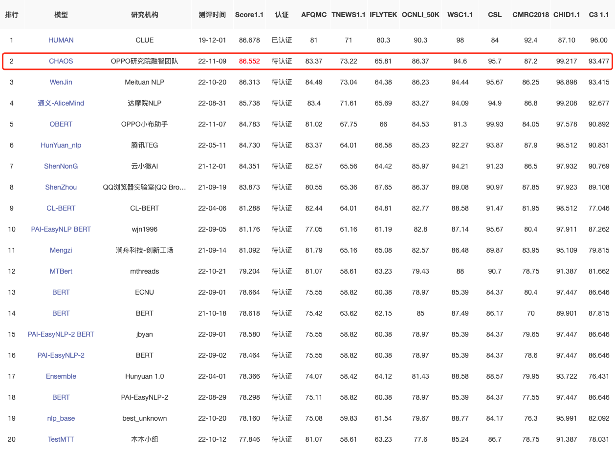2022年11月9日,OPPO语音语义研究部融智团队提出的中文预训练大模型CHAOS ,在中文自然语言理解测评基准CLUE上登顶,以30亿参量同时刷新了CLUE总排行榜、CLUE分类任务排行榜和CLUE阅读理解排行榜的最好成绩。其中在“AFQMC,TNEWS,CSL,CHID1.1”4个赛道的成绩超过了人类识别精确准确度,总成绩距离超越人类表现仅差0.1。