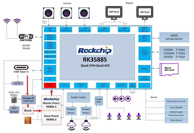RK3588S同样配备RK806-2双PMIC的供电方案;存储采用 LPDDR4X、eMMC、SD3.0;拥有 eDP TX、MIPI D/C PHY TX、MIPI D/C PHY RX、MIPI DPHY RX、PCIe20、TYPEC、音频输出、阵列MIC输入等外设接口。