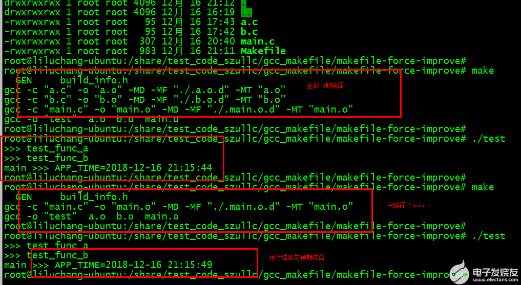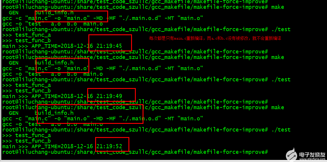 由上可知,经过改造后的Makefile是实现了我们的需求,每次build_info.h重新生成,导致main.c包含了build_info.h也会重新编译,而a.c和b.c没有被修改,所以在未执行make clean的情况下,a.c和b.c是不会被重新编译的,每次都是仅仅main.c被再次编译,从而重新生成新的test可执行文件。这样就是已经达到了【当C文件包含的头文件修改了的时候,C文件必须重新编译】的目的。