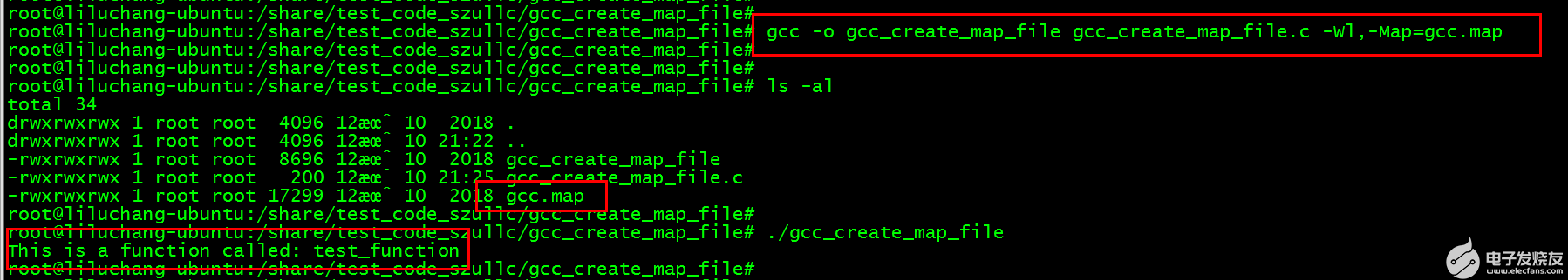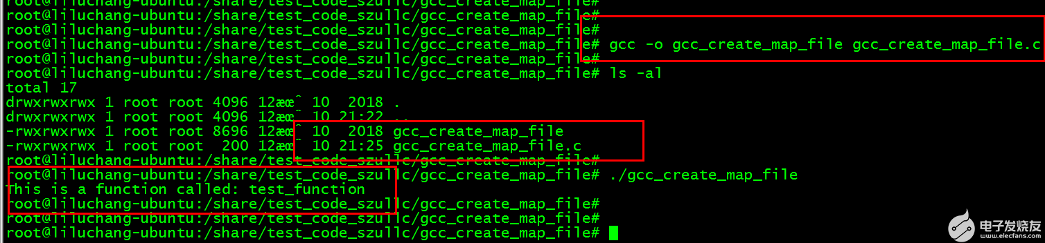 运行结果完全符合我们的期望,编译命令完成后,在当前目录下,生成了gcc_create_map_file这个可执行文件。