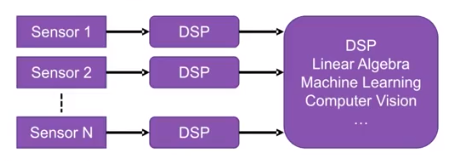 在前端处理上,DSP处理与传感器相关的输出信息,这些前端处理上往往会涉及包括F相关算术运算,比如FFT,CFAR,以及线性代数和非线性代数,以及向量运算等等基础的资料处理运算。后端处理根据应用会有很大的变化,像物体侦测、物体识别,物体追踪等等应用里DSP运算会随着时间不断演进,运算的资料形态也根据实际情况不尽相同,运算多样弹性较高。