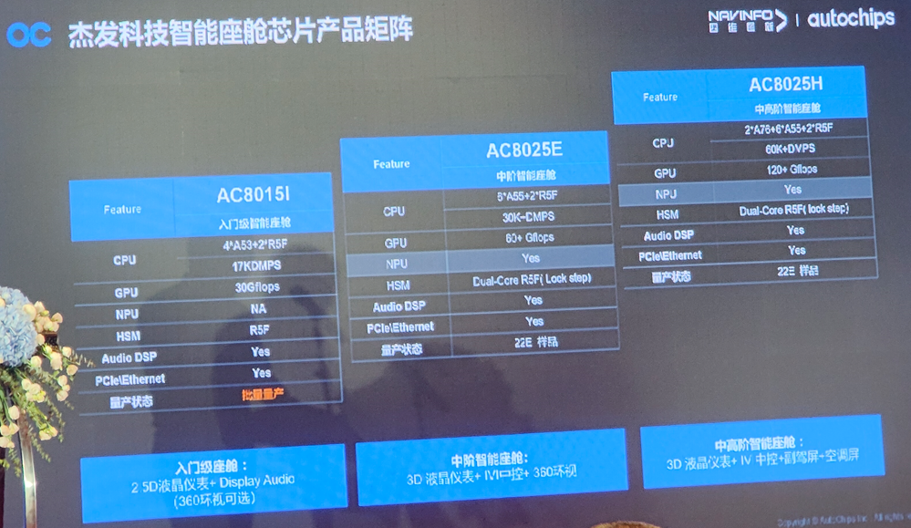 AC8025就是在此背景下推出的,据杰发科技高级产品经理赵林祥介绍,目前,杰发科技在不断丰富自身的座舱SoC产品线,其中包括已经量产的入门级座舱芯片AC8025I,及年底即将推出的定位中端和中高端智能座舱应用的AC8025E和AC8025H。