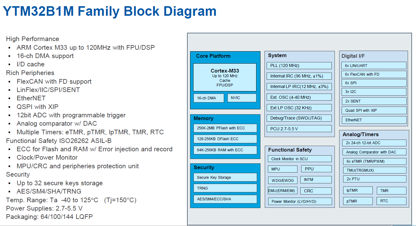 据苏州云途半导体有限公司技术市场总监顾光跃介绍,YTM32B1M是今年量产的第二款高端车规级M系列产品,是目前国内唯一量产的符合AEC-Q100和ISO26262 ASIL-B双重认证的高性能、高可靠性、高安全性的车规级MCU产品。该芯片对标NXP的SC24K14系列,采用了行业领先的40nm e-Flash工艺,基于32位车规级Arm Cortex-M33内核,CPU全温域主频高达120MHz,提供1.25MB嵌入式闪存,符合ISO26262的ASIL-B等级要求,可靠性满足AEC-Q100、Grade1标准,信息安全方面支持AES、SHA以及国密SM4等多种加密算法,并提供符合AUTOSAR标准的MCAL。可用于车身、底盘、动力域等场景。