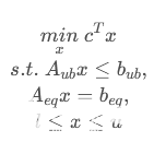 scipy.optimize.linprog(c,A_ub=None,b_ub=None,A_eq=None,b_eq=None,bounds=None,method=‘interior-point’,callback=None,options=None,x0=None)