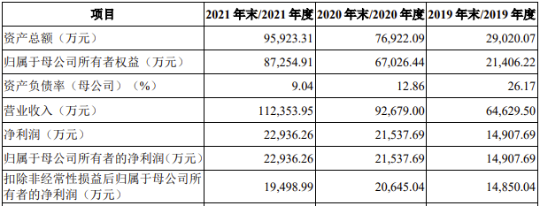 2019年至2021年营收分别为6.46亿元、9.27亿元、11.2亿元;同期对应的净利润分别为1.49亿元、2.15亿元、2.29亿元。2019年-2021年。报告期内的营收和净利润年均复合增长率分别为31.85%、24.04%。
