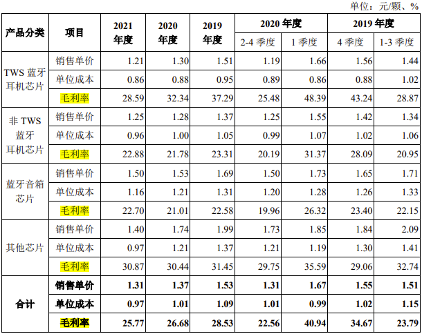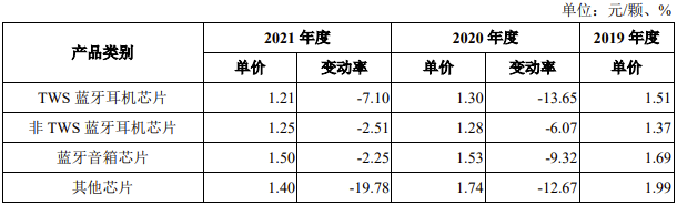 通过招股书,可以明显看到,中科蓝讯产品单价不断下调。在最重要的TWS蓝牙耳机芯片产品上,2019年到2021年的单价分别为1.51元/颗、1.3元/颗、1.21元/颗,其中2020年变动率达到13.35%。整体芯片销售单价分别为 1.53 元/颗、1.37 元/颗和 1.31 元/颗。