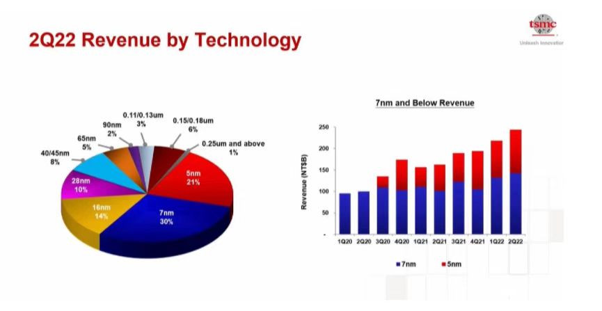 从其财报来看,台积电二季度先进制程产能满载,营收明显增长。5nm制程出货占第二季度晶圆销售额的21%,上年同期为18%,营收占比进一步提高;7nm制程出货占第二季度晶圆销售额的30%,上年同期为31%。两者占比合计达51%。