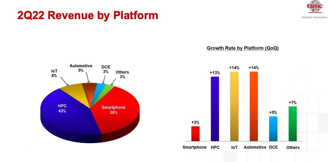 手机领域营收占比继续下滑,二季度收入占比降至38%,一季度为40%。而高性能计算业务增长强劲,二季度营收占比达到43%,一季度为41%。得益于高性能计算市场的强劲需求,台积电第二季度营收、净利润维持较好增长。