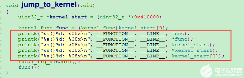 函数的第二句代码:kernel_func func = (kernel_func)kernel_start[0]; 这里用到了一个typedef定义的函数指针别名,它的定义为:typedef void (*kernel_func)(void); 它定义了函数指针,此指针指向一种函数,这种函数返回值为void型,入参也为void。所以 kernel_func func = (kernel_func)kernel_start[0]; 这整一句代码的意思就是: 定义一个名称为func的函数指针,它指向一个由kernel_start这个变量(地址为0x410000)代表的函数,为了保证函数指针赋值的正确性,还加上了(kernel_func)做强制类型转换。