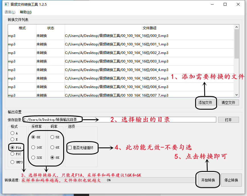 1、使用我们提供的工具软件,格式只能选择F1A,不能选择其他的格式,否则转换的文件是不能播放的