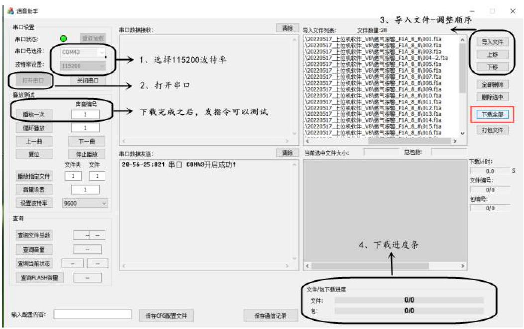 4、点击上位机上面的,打开串口,波特率固定115200 ,选择导入文件,再点击“下载全部”,等待完成5、注意下载完了之后,可以用芯片的4脚对地触发一下,试听下载的声音文件