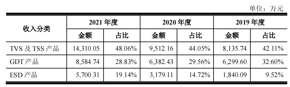 从2021年的营业收入结构来看,TVS及TSS产品营业收入为14310.05万元,占总收入的48.06%,GDT产品营业收入为8584.74万元,占总收入的28.83%,ESD产品营业收入为5700.31万元,占总收入的19.14%。