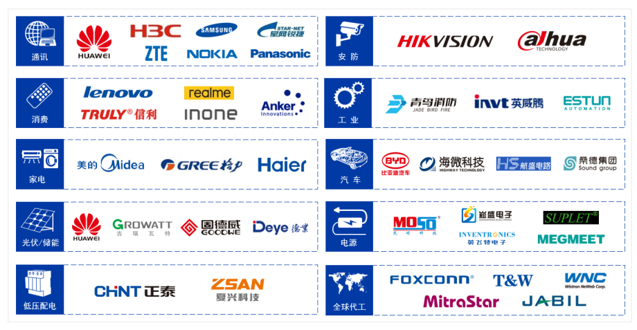 海康威视、大华股份、信利、青鸟消防、英威腾、埃斯顿、美的集团、格力电器、比亚迪、桑德、古瑞瓦特、固德威、英飞特、新雷能、茂硕电源、崧盛股份、富士康、共进股份、盟创、捷普等国内外
