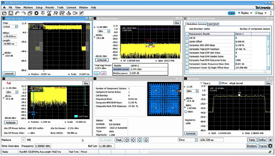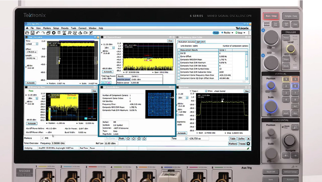 在MSO6B示波器上,我们运行SignalVu VSA软件,装有5G NR选配插件,我们把它配置成分析示波器通道1捕获的信号。