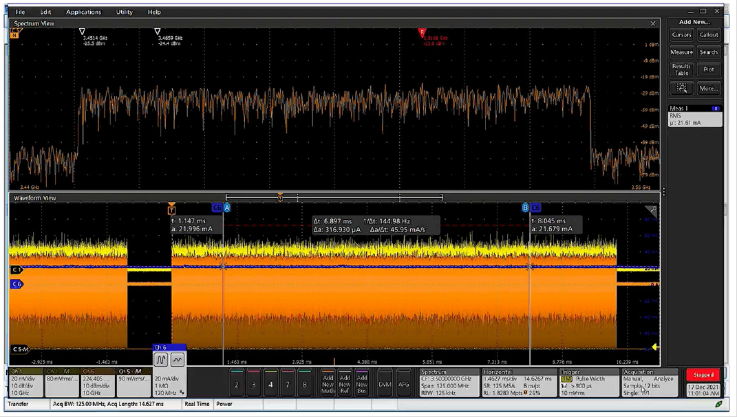 您怀疑这与电源有关,如果使用的是传统VSA,您会不知所措,只能不断地猜测。而MSO6B不同,它可以同时查看模拟信号、数字信号和RF信号,所以我们可以关联到根本原因。