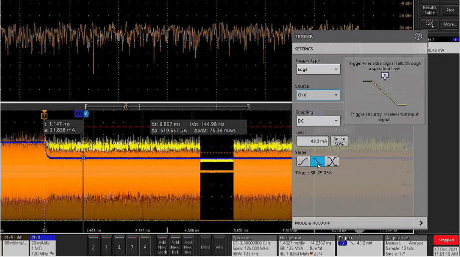 所以我们改变视角,在时域中触发电流,而不是在频域中触发RF脉冲。为此,我们将把触发源变成通道6上的电流探头,因为我们知道正确操作发生在47 mA,所以我们把触发点设置在43 mA,在下降时捕捉信号。我们设置成触发电流边沿,而不是脉冲。