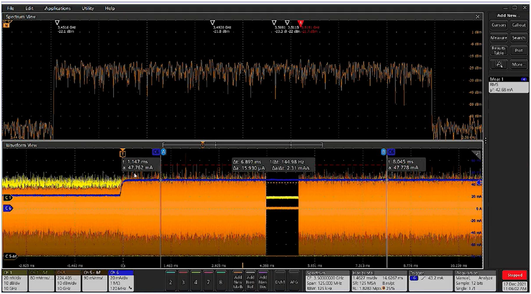 现在我们看一下在电流落在规范内时是否触发,看一下RF测量会发生什么情况。为此,我们只需把触发方向变成上升,现在可以捕获电流落在规范内的时点。在示波器应用中,我们的RF能量如预期那样恢复,看一下SignalVu VSA应用,捕获的每个5G信号都满足规范。只需按几下按钮,就可以把触发设置成捕获电流提高,在电流恢复正常时一直采集信号。