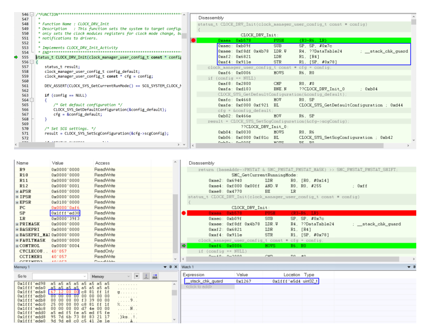4.编译工程。编译器会在需要堆栈保护的函数中添加如下操作:在函数入口处先入栈(Push),然后再额外保存堆栈金丝雀,具体的值用户可以在stack_protection.c中更改__stack_chk_guard;在函数出口,会检测堆栈金丝雀的值是否还是__stack_chk_guard,如果不是,说明堆栈被篡改,会调用__stack_chk_fail函数。
