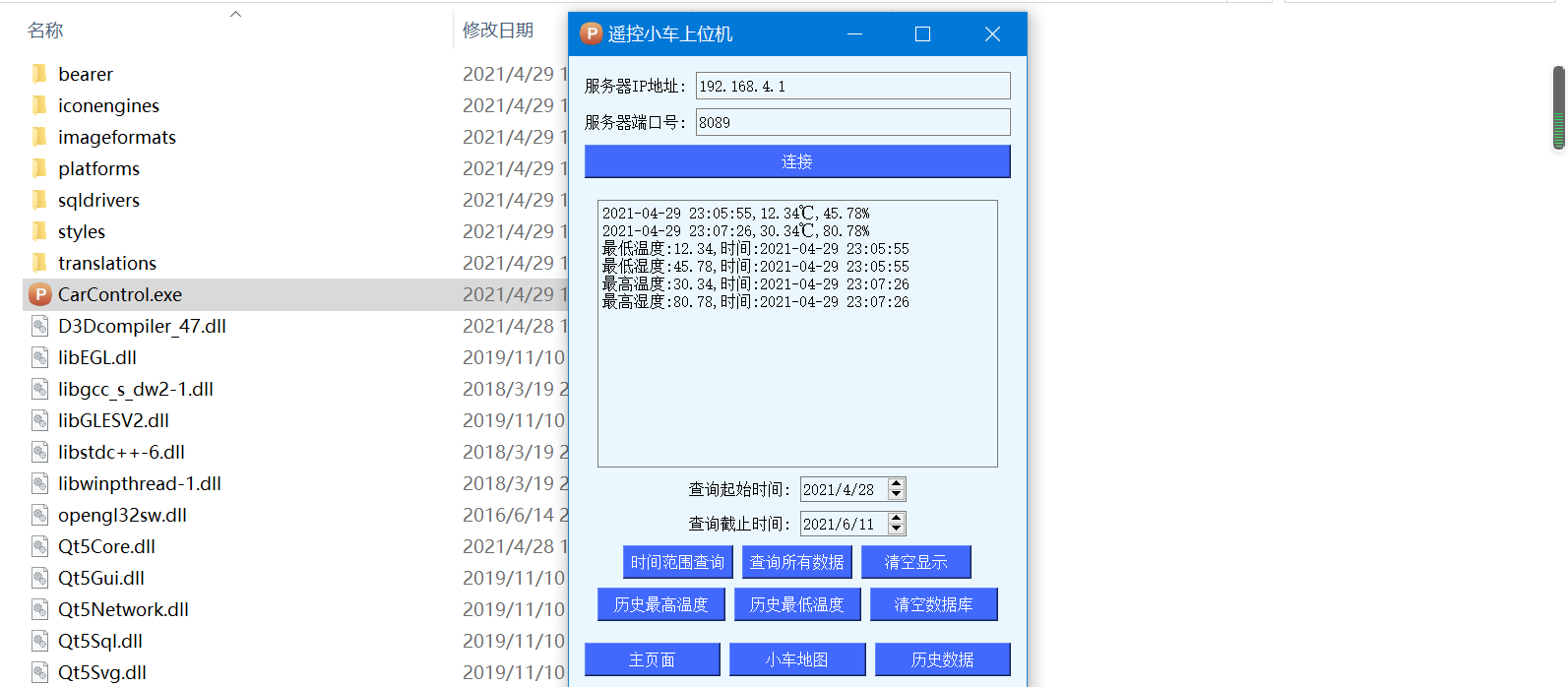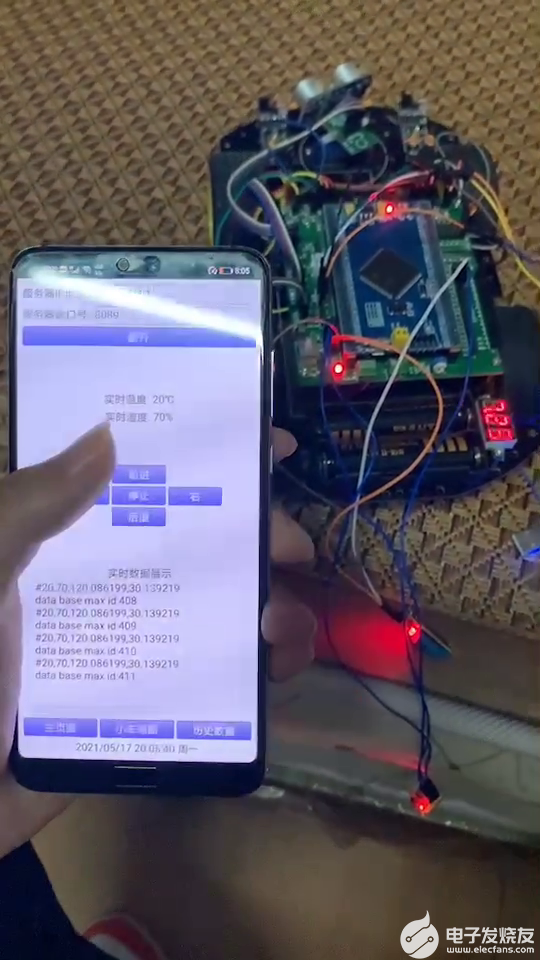 小车上会实时采集温度、湿度、GPS经纬度、通过ESP8266 WIFI上传至手机APP,手机APP收到数据之后,会将温湿度实时显示出来,经纬度收到后会调用百度地图,显示小车的位置,并且数据也会存放到数据库里,方便查看历史数据;支持范围内温湿度查询、最高温湿度、最低温湿度查询。