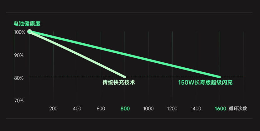 长寿版150W超级闪充在提升快速充电功率的同时,搭载OPPO自研的电池健康引擎,帮助手机在满充满放循环1600次后,电池还能拥有 80% 容量,使电池的寿命达到行业标准的两倍,有效保护电池健康。