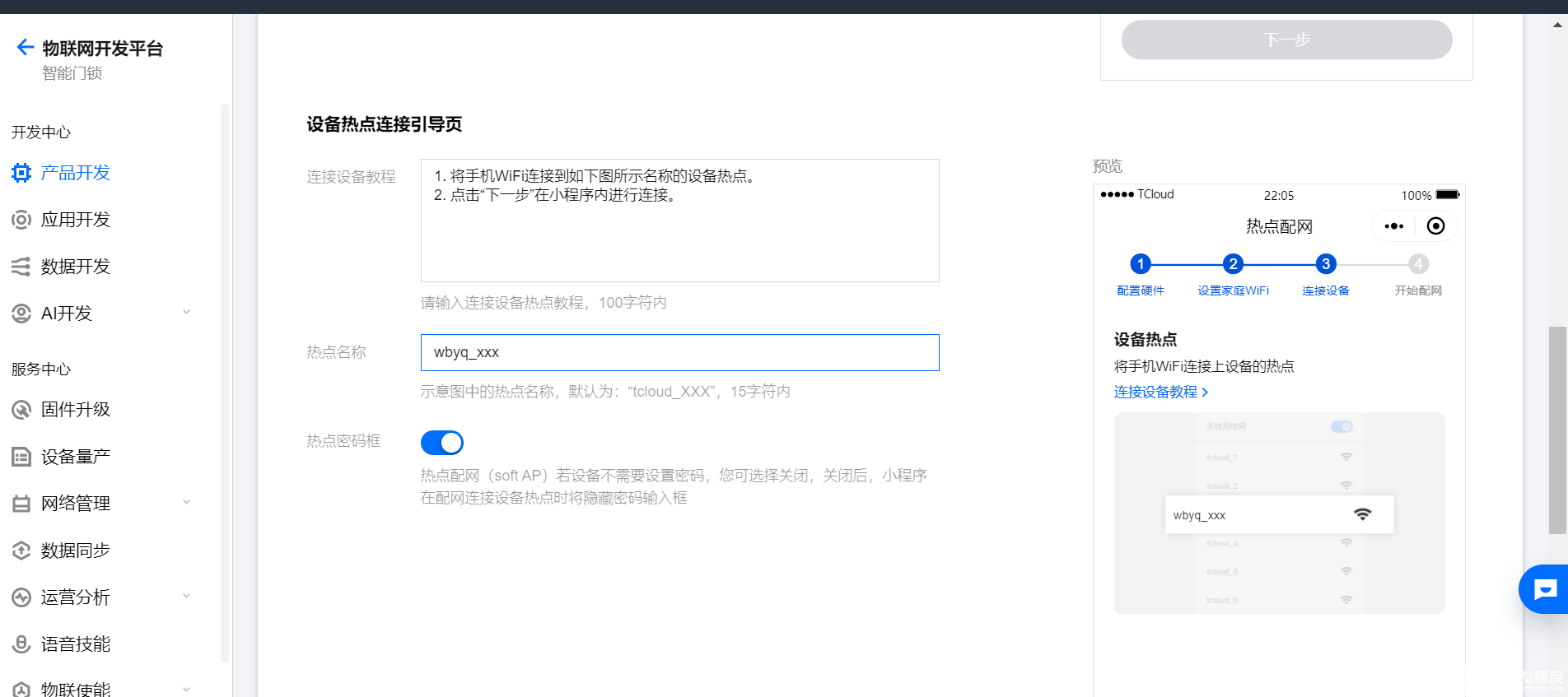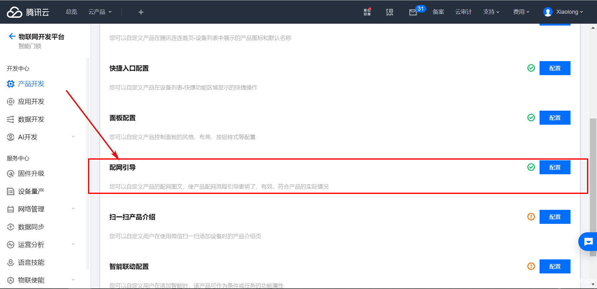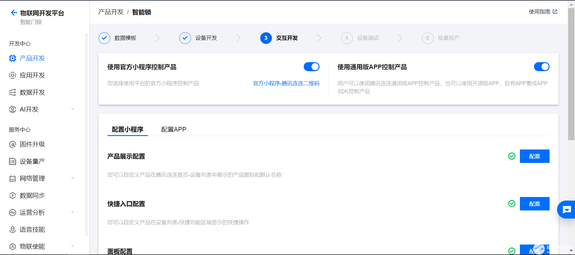 这里可以配置微信小程序的详细参数,配网的设置也这个页面上: