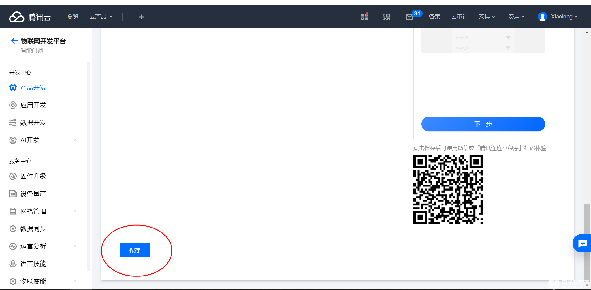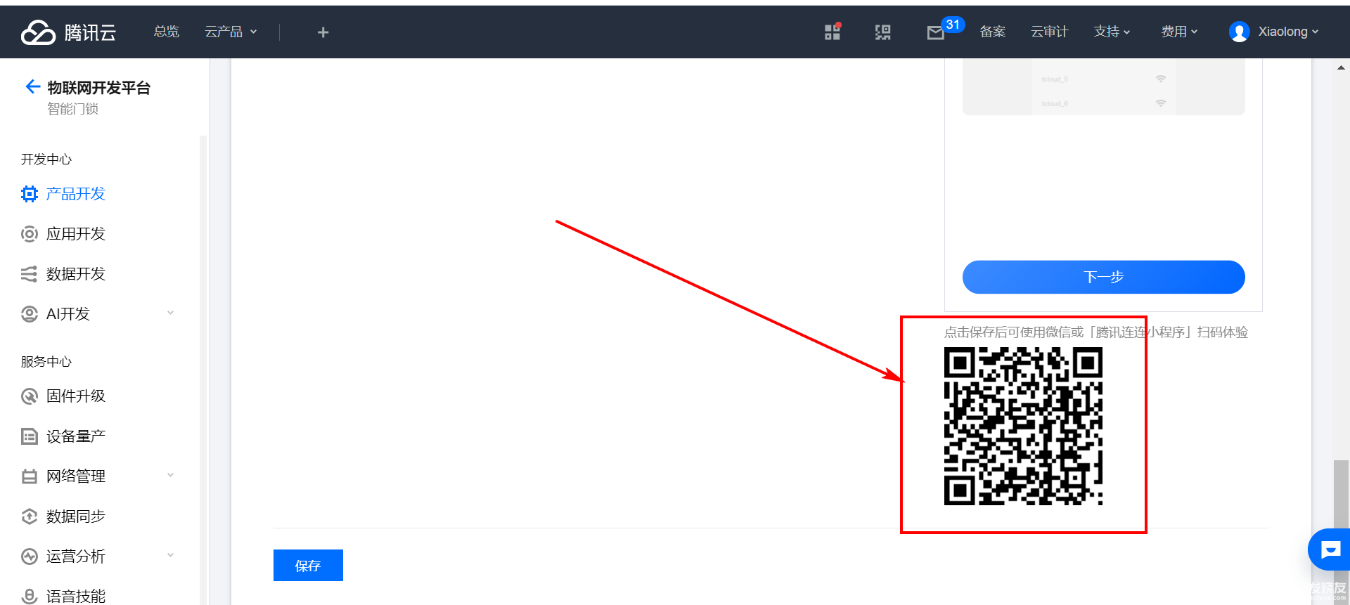 保存之后,打开微信小程序“腾讯连连”,扫描右下角的这个二维码,进行配网,完成设备添加。(一般正常产品,会将这个二维码打印出来,贴在设备上,方便用户扫描)