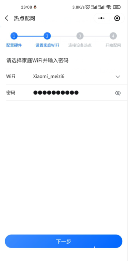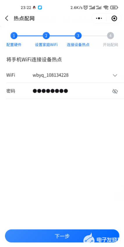 这时继续操作微信小程序上的步骤,选择设备的WIFI进行连接: 之后在下一个页面会自动等待配网成功(没有截图),设备配网成功之后会出现提示,这时设备就已经在线了