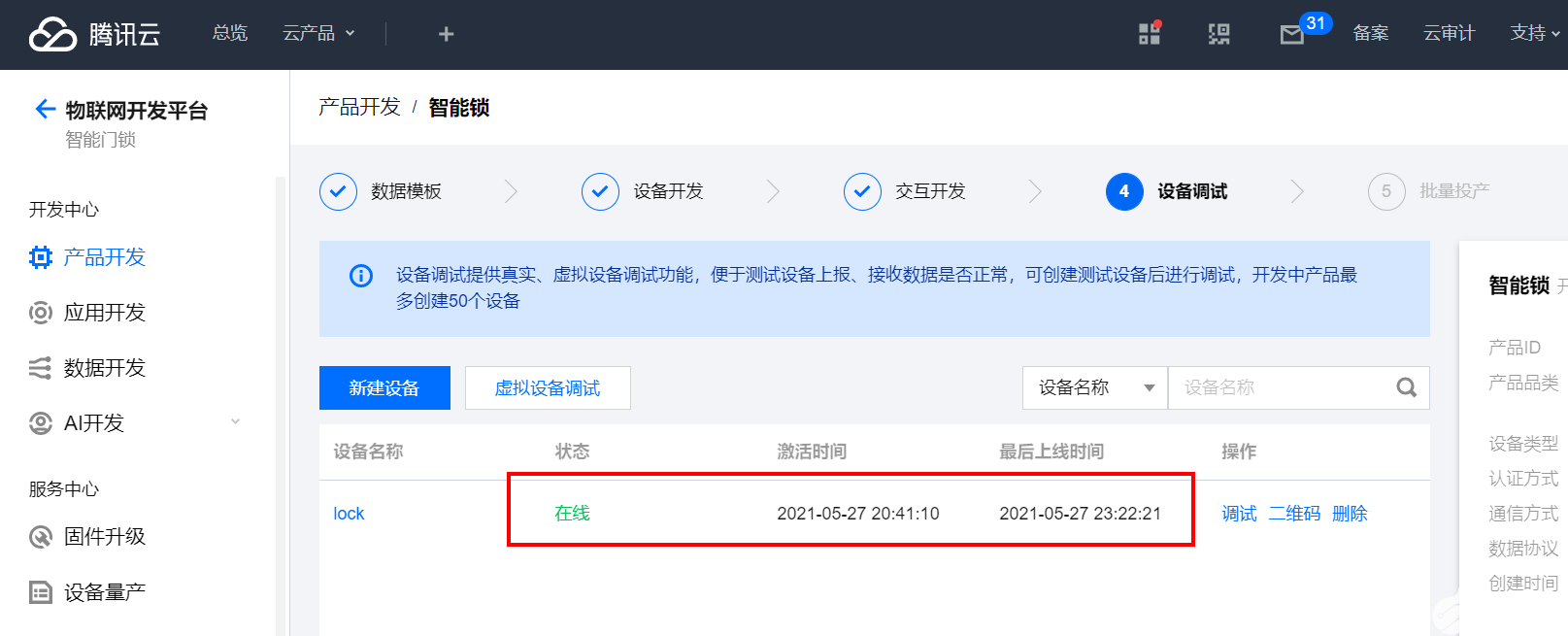 (提示: 做这一步,要先设计好设备端的程序,设备上电能正常的运行,才能做)