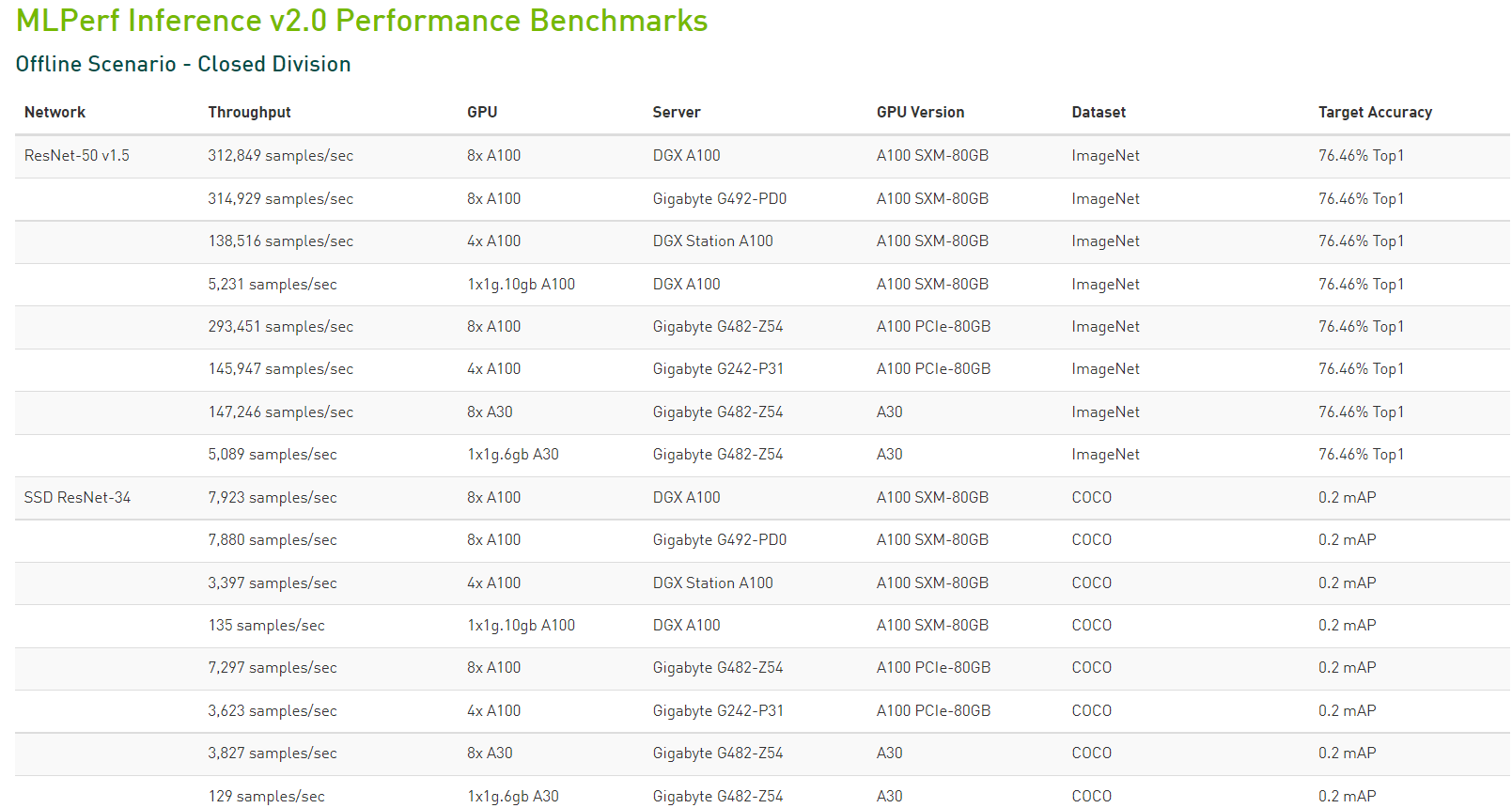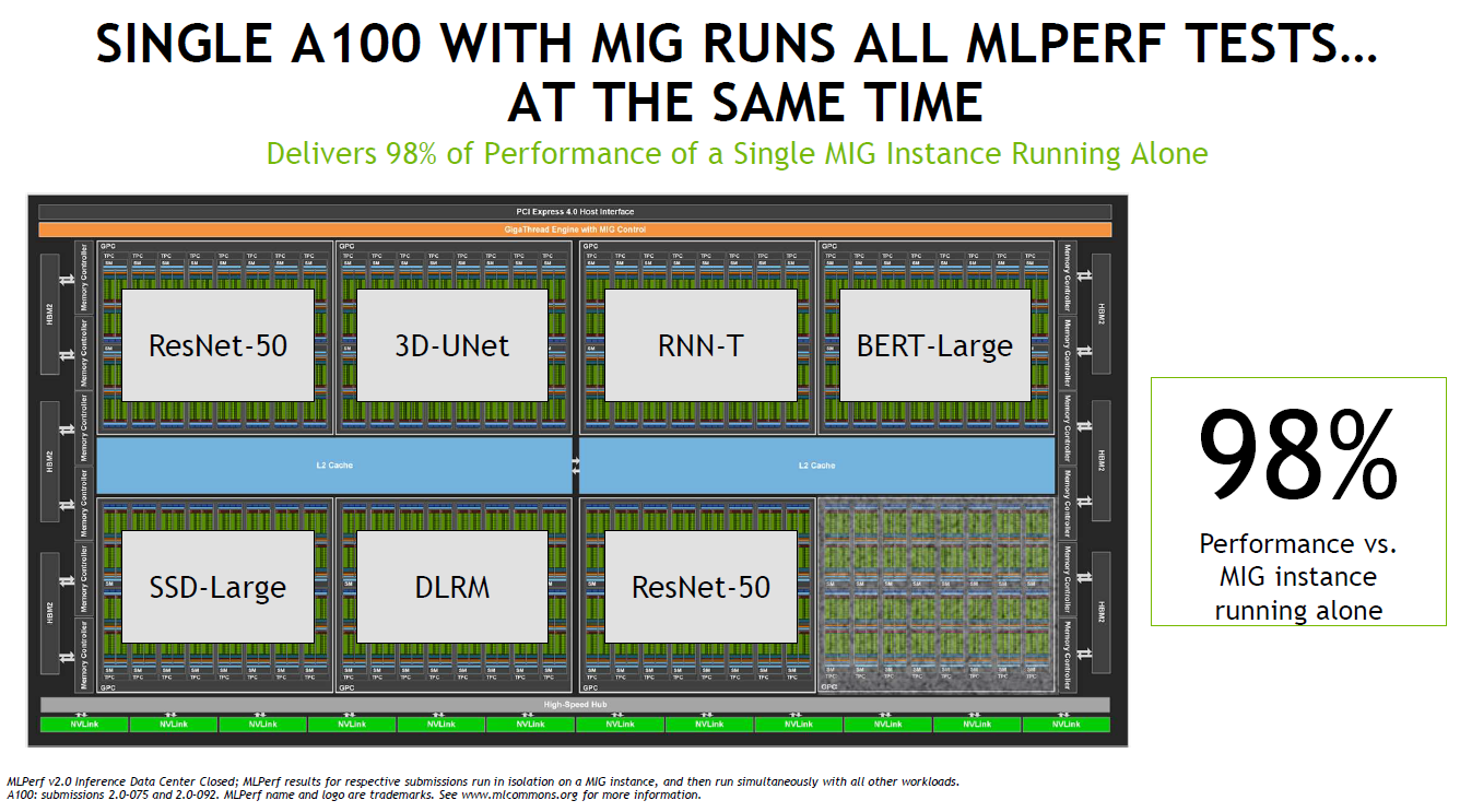 除了Orin之外,本轮MLPerf,验证了NVIDIA的多项成果,包括多实例GPU(MIG)、TensorRT等。比如MIG可提升每个 NVIDIA A100 Tensor 核心 GPU 的性能和价值。MIG可将 A100 GPU 划分为多达七个实例,每个实例均与各自的高带宽显存、缓存和计算核心完全隔离。管理员可以支持从大到小的各项工作负载,为每项工作提供规模适当的 GPU,而且服务质量 (QoS) 稳定可靠,从而优化利用率,让每位用户都能享用加速计算资源。