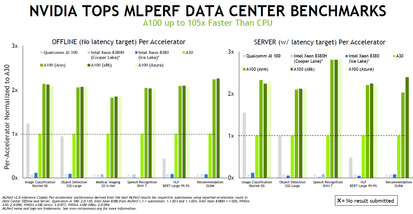 而也正是因为NVIDIA的跨平台管理能力,使A100在Arm和x86-64平台上的性能几乎相同。并且,通过NVIDIA的软件优化,AI性能在过去一年中就增长了高达50%。