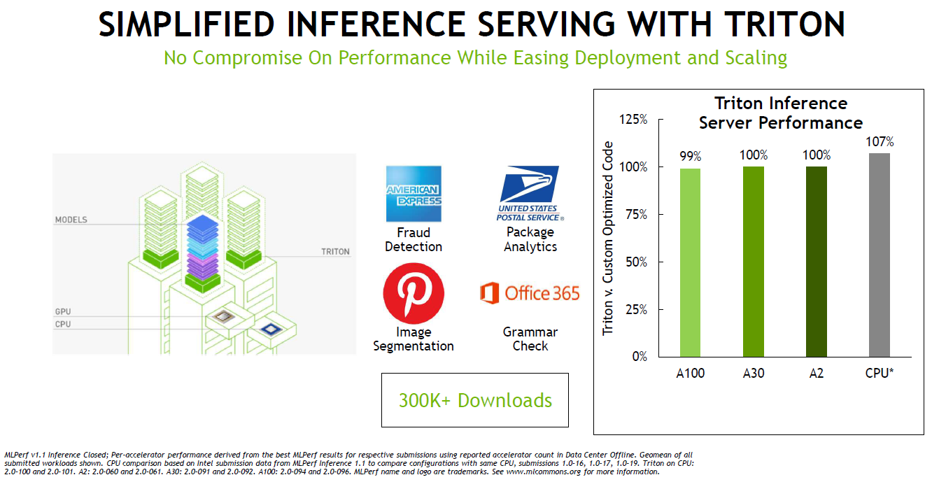 目前TensorRT广泛的优化GPU内核库已支持Jetson Orin,MLPerf中使用的插件已全部移植到Orin并添加到 TensorRT 8.4。Triton则Kubernetes紧密集成,可以管理GPU以及x86和Arm CPU上的AI推理工作,NVIDIA宣布,Triton现在可以只在CPU上运行,而无需GPU。