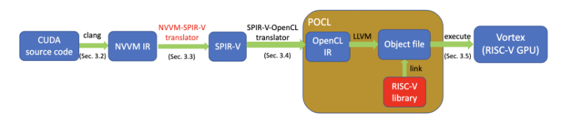 美国佐治亚理工学院的几位研究员鼓捣出了一种新的流水线,可让CUDA软件工具包为RISC-V的GPGPU提供支持,这样可以将现有的CUDA代码运行在RISC-V设备上。他们已经成功在RISC-V的GPU Vor