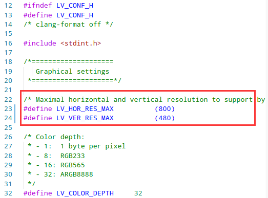 在lv_conf.h中,有显示屏分辨率的配置,LV_HOR_RES_MAX和LV_VER_RES_MAX,笔者使用的屏幕分辨率为800480,将这里修改为800480即可。