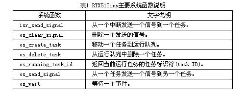 RTX51Tiny内核完全集成在Keil C51编译器中,以系统函数调用的方式运行,因此可以很容易地使用Keil C51语言编写和编译一个多任务程序,并嵌入到实际应用系统中。内核主要提供以下函数供应用程序引用,见表1。