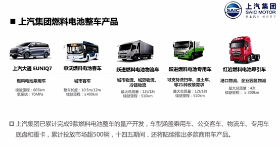除了政府的规划,车企也在积极布局。比如上汽集团已经累计完成了9款氢燃料电池整车的量产开发,车型涵盖乘用车、公交客车、物流车、专用车底盘和重卡,累计投放市场超500辆。上汽集团还表示,未来还会陆续推出多款商用车产品。
