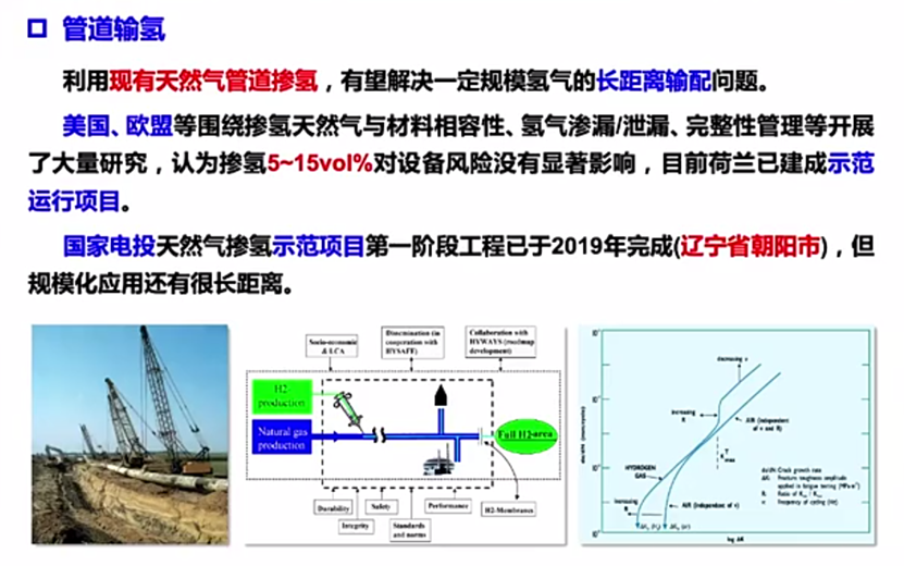 管道输氢方面,可以利用现有的天然气管道掺氢输送,这样可以解决一定规模氢气的长距离输配问题,但这也有一个问题,那就是如果是用于汽车的话,需要比较纯的氢,分离的成本会比较高。