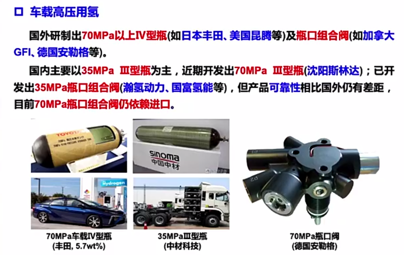 在车载高压用氢方面,国内主要以35MPa的Ⅲ型瓶为主,近期也开发出了70MPa Ⅲ型瓶,但国内限制必须是50MPa以下,因此目前我们用的还是50MPa以下的储氢罐。