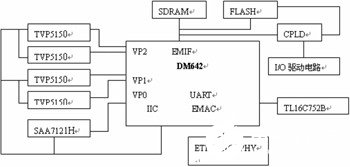 系统组成如图2所示,在图中TMS320DM642通过64位宽的EMIF(External Memory Interface)总线扩展外部存储器部分,包括32Mbytes的Synchronous DRAM,用于存放实际运行时用户代码和图像数据。4Mbytes的FLASH用于存放bootloader,以及用户的应用程序,启动时将FLASH中的代码和数据加载到内存中(SDRAM中),用户对与虚拟线圈的配置参数也可以存放在FLASH中。SDRAM的数据宽度为64位,FLASH的数据宽度为8位,分别对应TMS320DM642的CE0和CE1空间。同样地,通用异步收发器UART(Universal Asynchronous Receiver)和CPLD(Complex Programmable Logic Device)也是通过EMIF总线与DM642相连。UART用来扩展串口,本系统中可用其扩展了RS232接口。CPLD用来实现FLASH和UART的粘合逻辑及扩展通用数字I/O。为了方便软件的实现,本系统中将这两部分也连接到了DM642的CE1空间,其内部寄存器作为CE1存储空间的一部分。