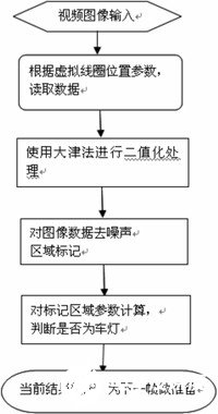 晚上的路面能见度比较低,算法主要是对车灯的识别。在晚上,车灯有很强的亮度,所以只要能正确的检测到车灯就可以进行车辆的测量。算法的干扰来自路面对车灯发出来的光线的反射。通过使用Matlab仿真试验后发现,二值化去噪以后,车灯的亮斑基本上是车灯的形状,而路面反光区向前发散,据此可以通过检测窗上亮斑的形状特征来识别车灯和路面反光区。夜间的算法如图2夜间算法流程图所示。对虚拟线圈二值化的阈值选取是通过大津法得到的,与经验法相比,大津法是通过计算方差得到阈值,环境适应能力比较强,但这也增加了算法的时间和空间复杂度。图像去噪是使用3×3的中值滤波器,我们对其进行了快速算法的改进,并且只对虚拟线圈进行。