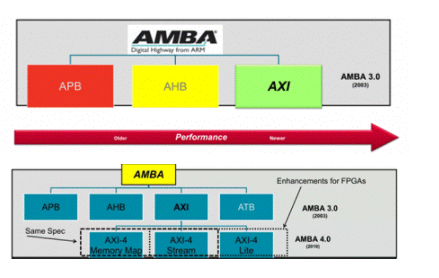 高级可扩展接口 AXI(Advanced eXtensible Interface):是 ARM 公司 AMBA 3.0 和 AMBA 4.0 规范的一部分,是并行高性能,同步,高频,多主机,多从机通讯接口,主要设计用于片上通讯。为啥说 AXI 是 AMBA 的一部分,看看下面两个图就可以比较清晰的了解。
