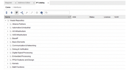 Vivado 内置了大量的 IP 可供使用,比如数学计算 IP,信号处理 IP、图像视频处理 IP,通信互连(以太网、DDS、调制、软件无线电、错误校验)、处理器 IP(MicroBlaze 等)、甚至人工智能算法 IP。
