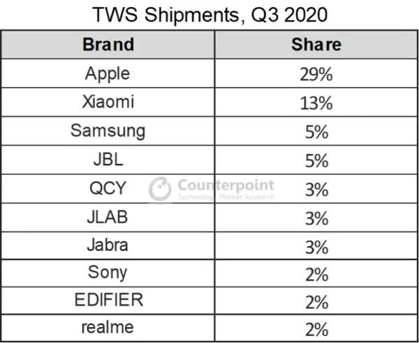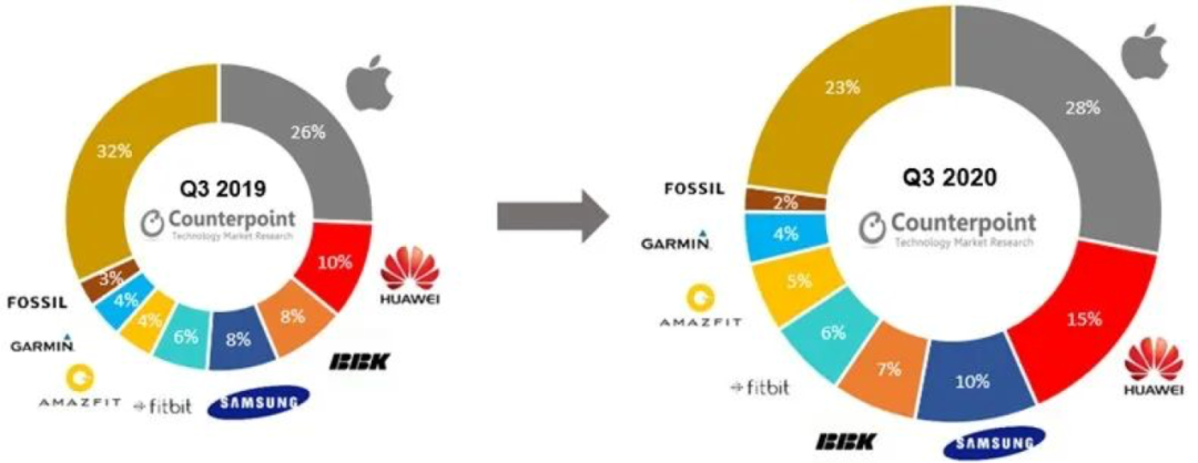 市场研究机构 Counterpoint 公布了最新的 2020 年第三季度可穿戴设备出货量和市场份额报告。