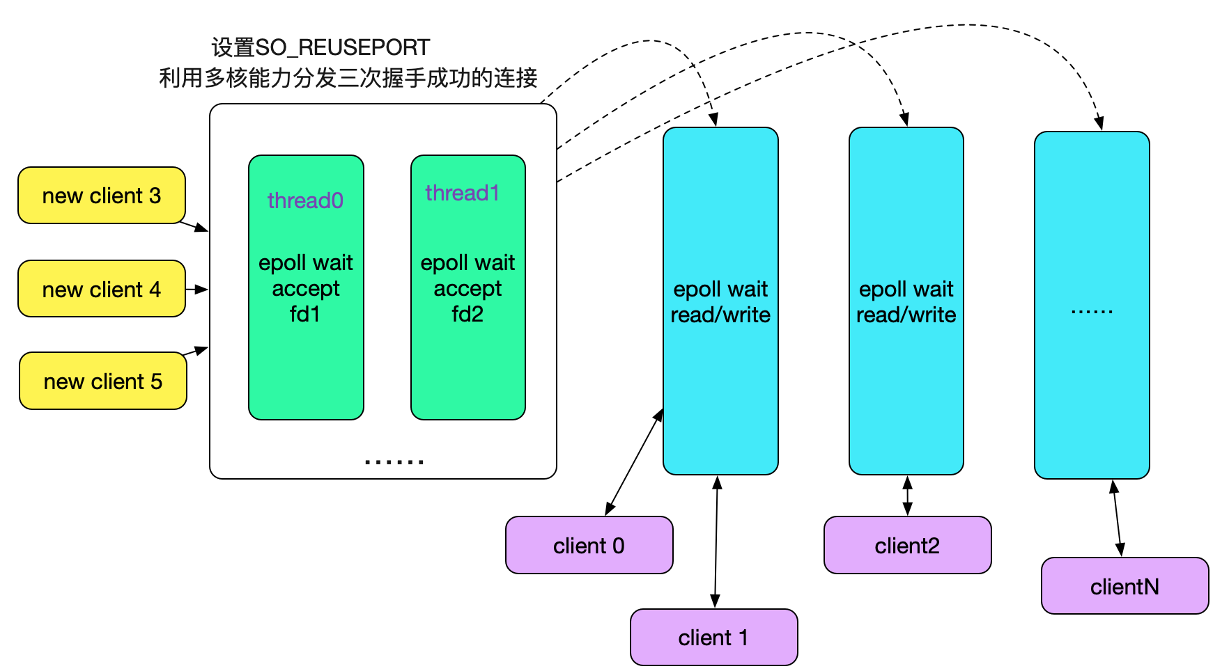 直接在内核层面做负载均衡,将accept的任务分散到不同的线程的不同socket上(Sharding),毫无疑问可以多核能力,大幅提升连接成功后的socket分发能力。