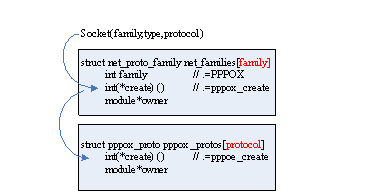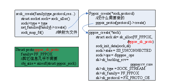 创建的总体过程,第一节已讲过了,下面以pppoe为例,描述一个socket插口的具体创建过程: